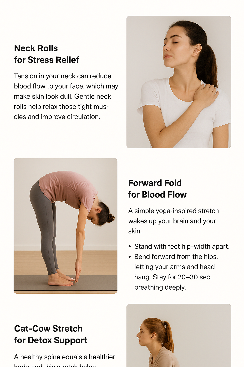 Just 10 minutes of gentle stretching in the morning can improve circulation, reduce stress, and boost that natural glow from the inside out.